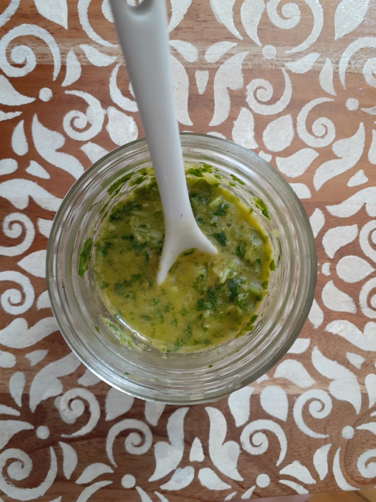 - Mettre tous les ingrédients au robot culinaire (blender) et réduire en purée. Il faut mettre la coriandre entière (feuilles et tiges, sans les racines…)