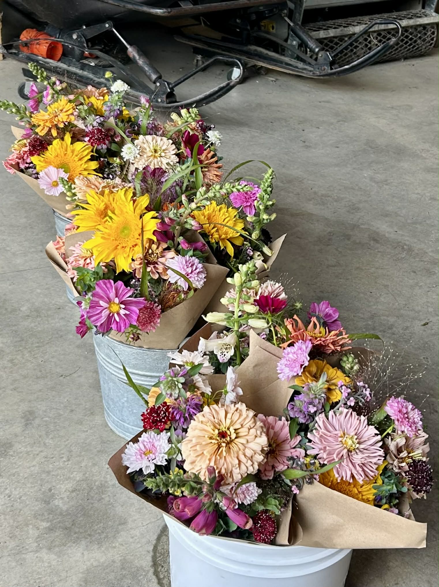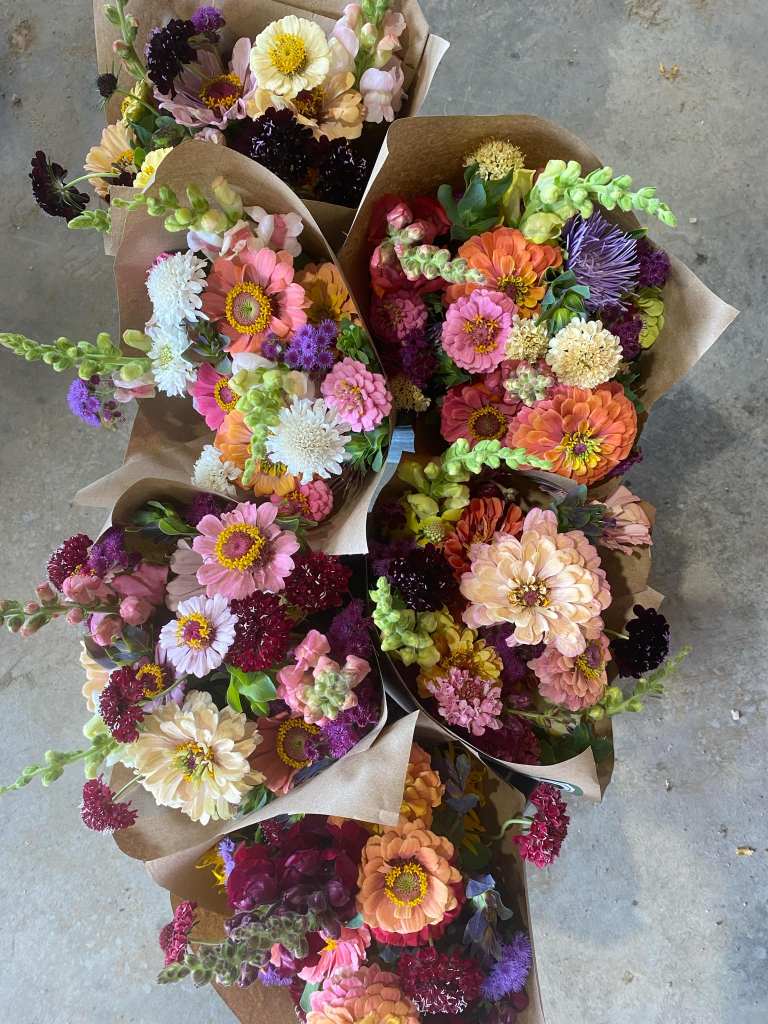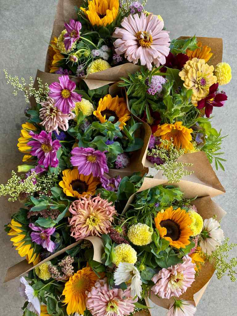 À la ferme: Les bouquets de fleurs seront distribués en même temps que les marchés de légumes, soit les jeudis de 15h30 à 18h30 à la ferme OU les vendredis de 15h à 17h à la ferme aussi.