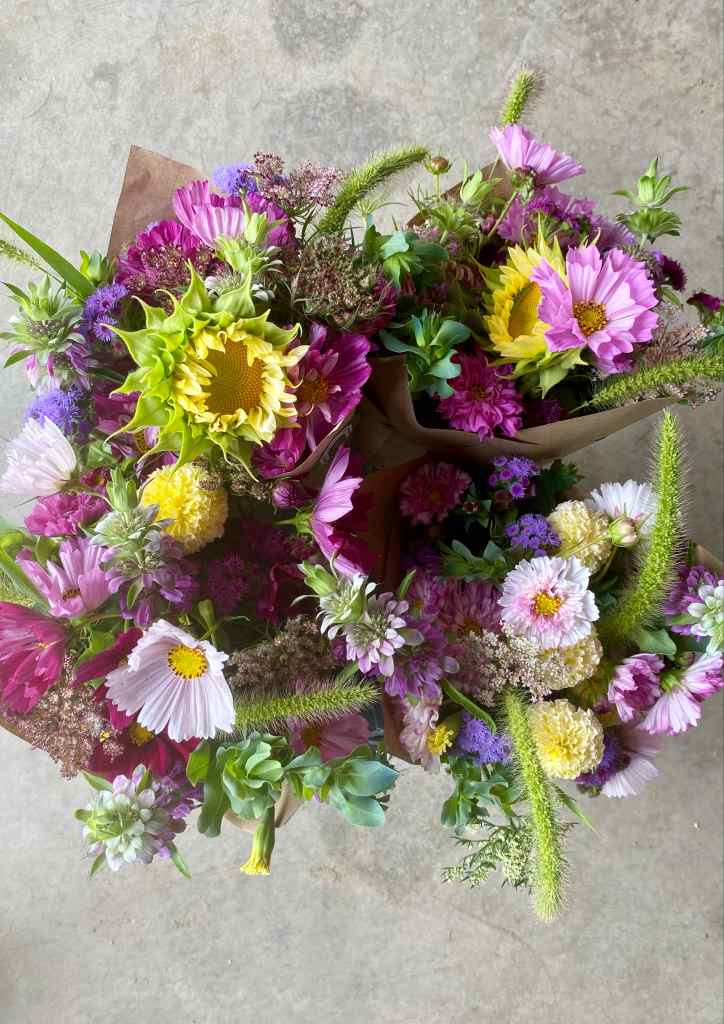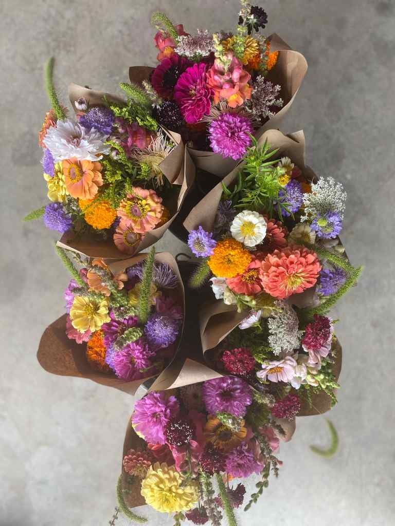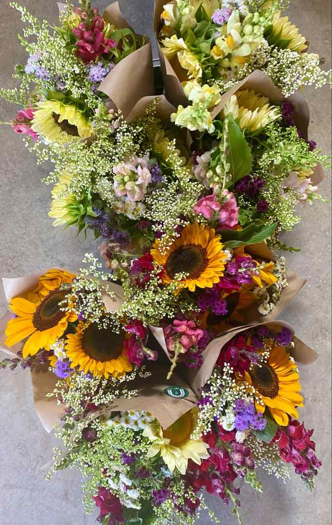 À la ferme: Les bouquets de fleurs seront distribués en même temps que les marchés de légumes, soit les jeudis de 15h30 à 18h30 à la ferme OU les vendredis de 15h à 17h à la ferme aussi.